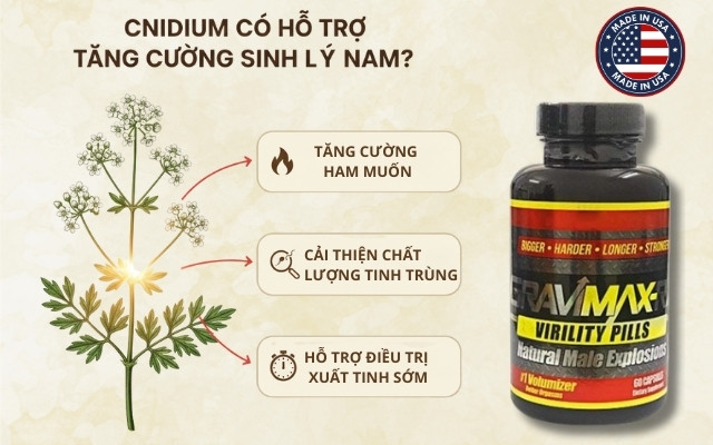 - Tăng cường ham muốn (libido): Cnidium được cho là có khả năng kích thích cơ thể sản sinh oxit nitric (NO). Oxit nitric không chỉ giúp giãn mạch máu mà còn đóng vai trò quan trọng trong việc truyền tín hiệu thần kinh liên quan đến ham muốn tình dục. Khi nồng độ NO được cải thiện, nam giới sẽ cảm thấy hứng khởi và có ham muốn mạnh mẽ hơn một cách tự nhiên.
